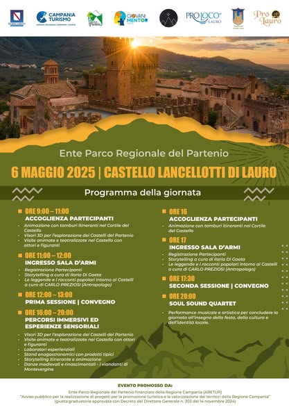 Su iniziativa dell'Ente Parco del Partenio, apre le porte al pubblico per un'intera giornata l'affascinante Castello Lancellotti di Lauro, dove sono in programma, oltre all'esplorazione dell'edificio storico, visite teatralizzate in costume, danze medievali, storytelling e leggende, degustazioni e momenti dedicati all'enogastronomia del territorio e due convegni, al mattino, "Storie e leggende dei castelli - Turismo sostenibile nella Campania interna" e, nel pomeriggio, "Tradizione e turismo gastronomico nei borghi del Partenio".